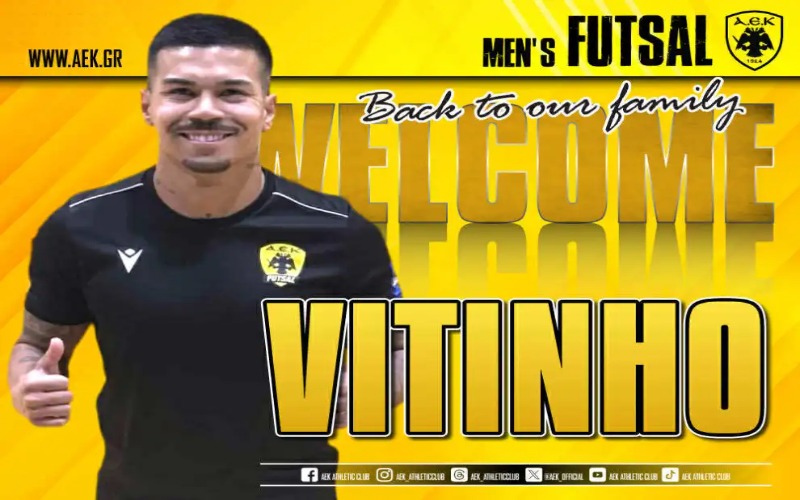Η ΑΕΚ βρίσκεται στην ευχάριστη θέση να ανακοινώσει την έναρξη της συνεργασίας της με τον Βιτίνιο (Victor Seiji Martins de Souza). Ο 31χρονος αθλητής, Βραζιλιάνος με υπηκοότητα από την Αρμενία, με την οποία είναι και διεθνής, υπέγραψε για 1+1 χρόνια και επιστρέφει στην ανδρική ομάδα Futsal της ΑΕΚ.