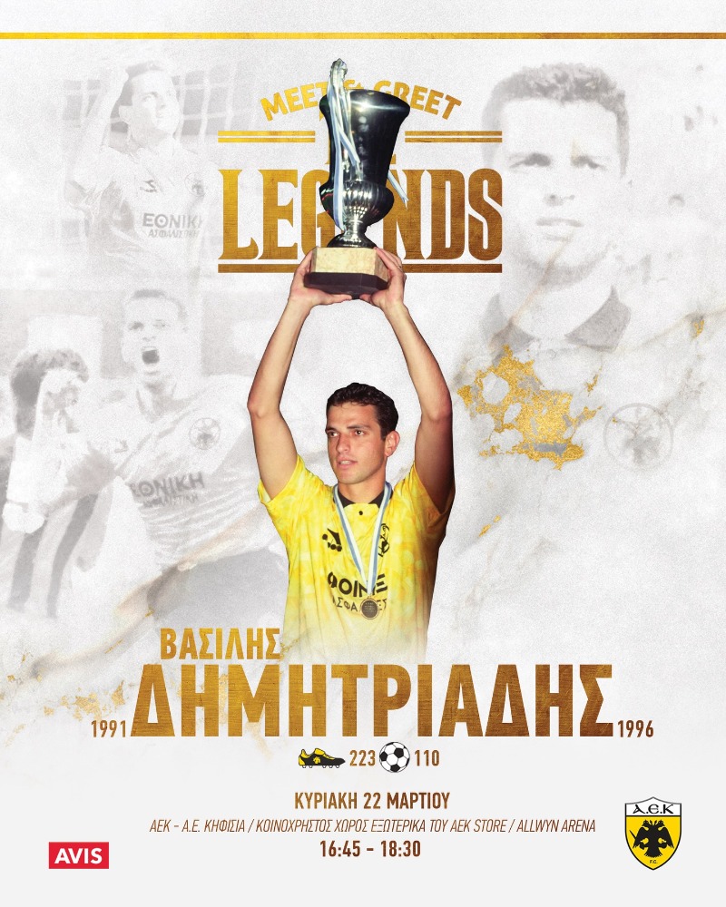 Ο Βασίλης Δημητριάδης θα βρίσκεται την Κυριακή 22 Μαρτίου στην ALLWYN Arena για να συναντήσει τους οπαδούς της ΑΕΚ και να υπογράψει αυτόγραφα.