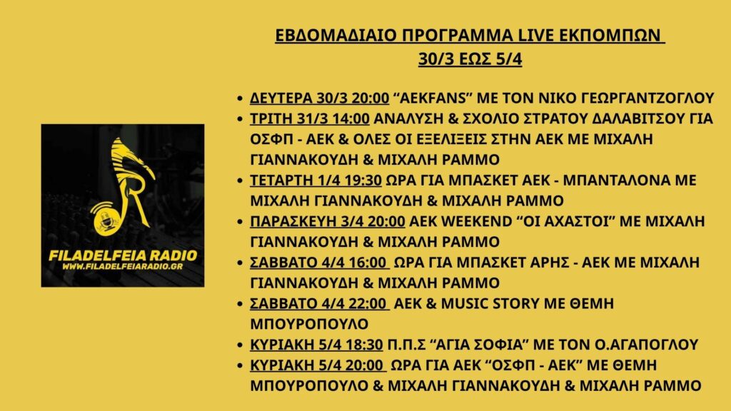 Το πλήρες πρόγραμμα των live εκπομπών παρουσιάζουν το AEKIDEA.ORG Web TV και το FiladelfeiaRadio.gr, προσφέροντας καθημερινή ενημέρωση, ανάλυση και συζήτηση γύρω από την επικαιρότητα της ΑΕΚ και όχι μόνο.