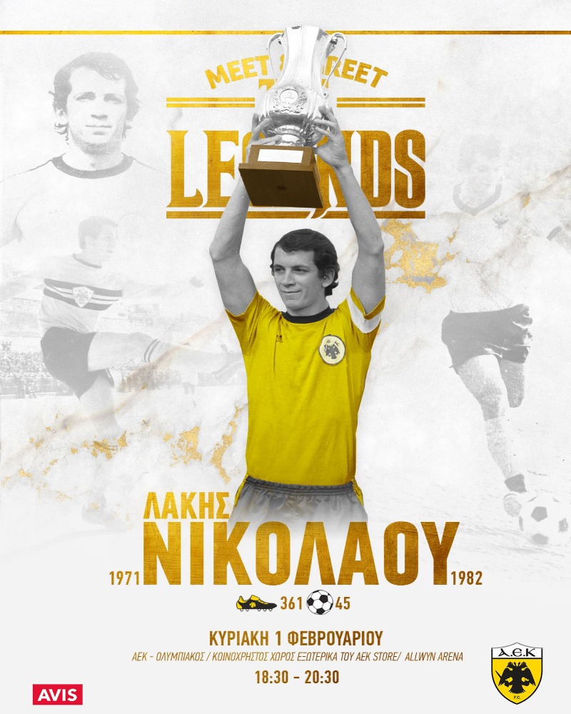 Στο πλαίσιο της δράσης «Meet and Greet the Legends», ο Λάκης Νικολάου, μία από τις πιο εμβληματικές μορφές στην ιστορία της Ένωσης, θα δώσει το «παρών» για να συναντηθεί με τον κόσμο της ΑΕΚ, να φωτογραφηθεί μαζί του και να υπογράψει αυτόγραφα.