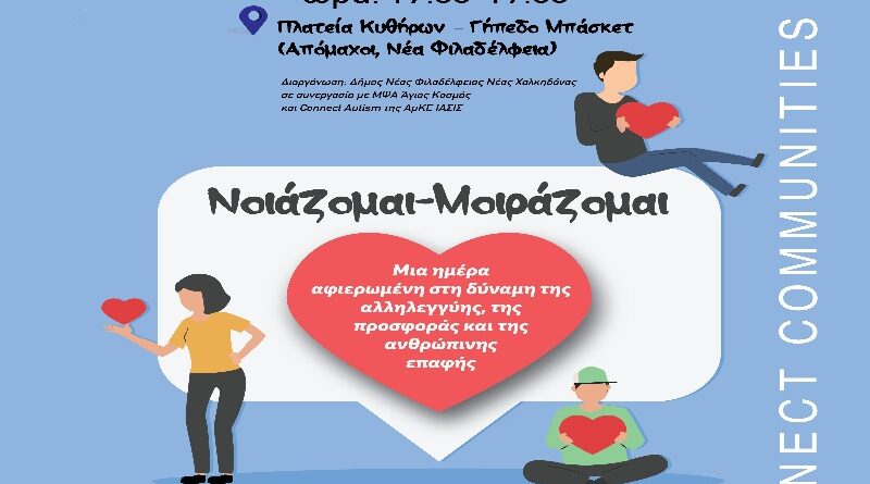 Η ΜΨΑ Άγιος Κοσμάς ,το CONNECT AUTISM της ΑμΚΕ ΙΑΣΙΣ, σε συνεργασία με τον Δήμο Νέας Φιλαδέλφειας – Νέας Χαλκηδόνας, σας προσκαλούν στην εκδήλωση “Νοιάζομαι & Μοιράζομαι” στο ανακαινισμένο Γήπεδο Μπάσκετ στην Πλατεία Κυθήρων (περιοχή Απομάχων, Νέα Φιλαδέλφεια).
