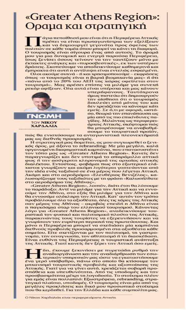Το όραμά του για την τουριστική ανάπτυξη της Αττικής, μέσα από το rebranding της Περιφέρειας ως «Greater Athens Region» παρουσίασε ο Περιφερειάρχης Νίκος Χαρδαλιάς σε άρθρο του στην εφημερίδα «ΤΑ ΝΕΑ Σαββατοκύριακο».