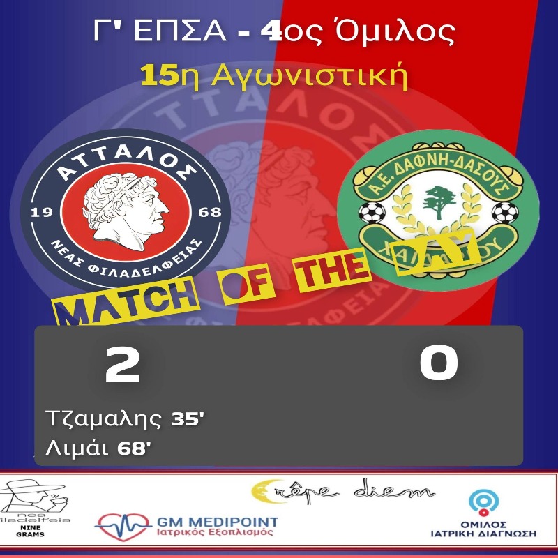 Νίκη για τον Άτταλο Νέας Φιλαδέλφειας ο οποίος στα πλαίσια της 15ης αγωνιστικής αντιμετώπισε ως γηπεδούχος στην έδρα του αντιπάλου, τον Δάσο Χαϊδαρίου. Το σκόρ 2-0 και παραμονή στην κορυφή του ομίλου. Ο Γιώργος Λιάπης και οι ποδοσφαιριστές αντιμετώπισαν την αναμέτρηση με την δέουσα προσοχή και αγωνιστικότητα παρόλο τις σημαντικές απουσίες και την κακή μέρα αρκετών ποδοσφαιριστών.