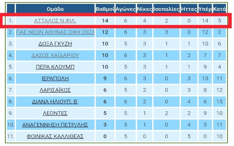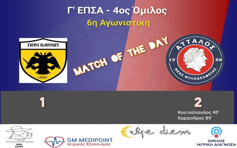 Νίκη πρωτιάς για τον Άτταλο Νέας Φιλαδέλφειας με σκόρερ τον Κουτσόπουλο στο 40′ και τον Καραϊνδρό στο 89′ λεπτό που έδωσε και τους τρεις βαθμούς