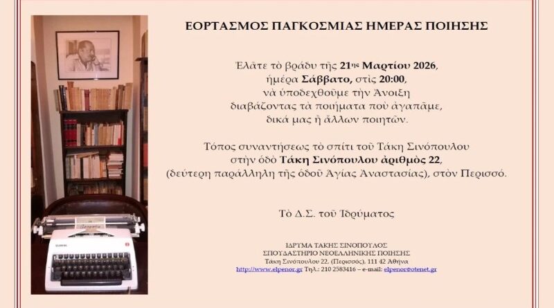Read MoreΔήμος Νέας Ιωνίας: Εορτασμός παγκόσμιας ημέρας ποίησης Ἐλᾶτε τὸ βράδυ τῆς 21ης Μαρτίου 2026, ἡμέρα Σάββατο, στὶς 20:00, νὰ ὑποδεχθοῦμε