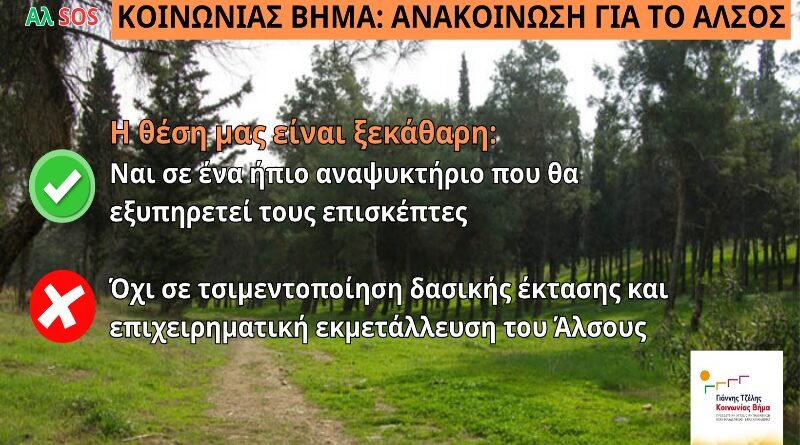 Read MoreΚοινωνίας Βήμα: Όχι σε τσιμεντοποίηση δασικής έκτασης και επιχειρηματική εκμετάλλευση του Άλσους Ανακοίνωση Παράταξης “Κοινωνίας Βήμα” για το ΑΛΣΟΣ Η