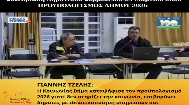 Read MoreΓιάννης Τζέλης: Γιατί η “Κοινωνίας Βήμα” καταψήφισε τον προϋπολογισμό του Δήμου για το 2026 Η ενημέρωση Η «Κοινωνίας Βήμα» καταψήφισε