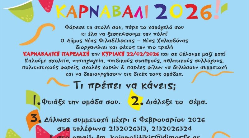 Read MoreΔήμος ΝΦ-ΝΧ: Αποκριάτικες Εκδηλώσεις 2026 – Δείτε το πρόγραμμα Η ενημέρωση Με πλούσιο εορταστικό πρόγραμμα και δράσεις για μικρούς και