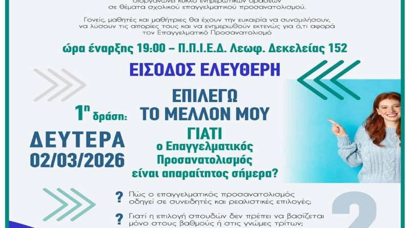 Read MoreΔήμος ΝΦ-ΝΧ: Δωρεάν ενημερωτικές δράσεις Σχολικού Επαγγελματικού Προσανατολισμού για τους μαθητές και τις μαθήτριες του Δήμου μας Ο Δήμος Νέας