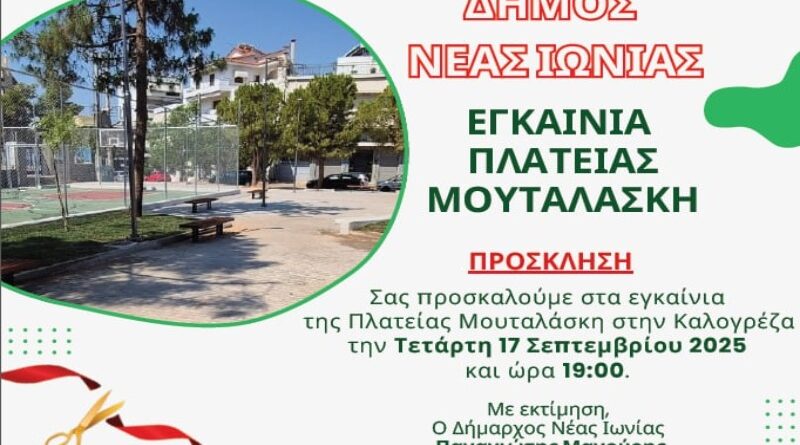 Read MoreΔήμος Νέας Ιωνίας: Εγκαίνια Πλατείας Μουταλάσκη! Η ενημέρωση Εγκαινιάζουμε την Πλατεία Μουταλάσκη στην Καλογρέζα, την Τετάρτη 17 Σεπτεμβρίου και ώρα