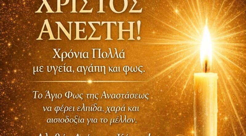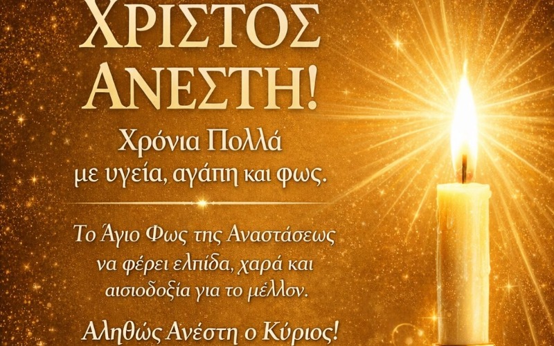 «Χρόνια Πολλά με υγεία, αγάπη και φως» είναι η ευχή που συνοδεύει αυτές τις άγιες ημέρες, ενώ το Άγιο Φως της Αναστάσεως μεταφέρει παντού το μήνυμα της ελπίδας και της νέας αρχής.