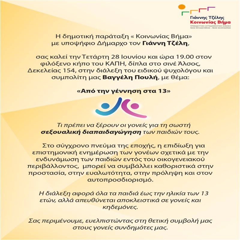 Δελτίο Τύπου-Πρόσκληση για την διάλεξη που διοργανώνει η παράταξη μας με ομιλητή τον Ειδικό Ψυχολόγο Βαγγέλη Πουλή με  θέμα:<<Από την γέννηση στα 13>>.