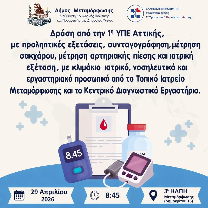 Η 1η Υγειονομική Περιφέρεια (Υ.Πε.) Αττικής, κατόπιν οδηγίας του Υπουργού Υγείας και με τη συμβολή της αρμόδιας Διεύθυνσης Κοινωνικής Πολιτικής και Προαγωγής της Δημόσιας Υγείας του Δήμου Μεταμόρφωσης, διοργανώνει δράση πρόληψης χρόνιων νοσημάτων.