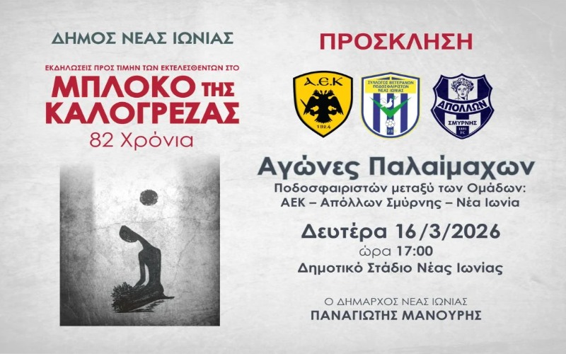 Ο Δήμος Νέας Ιωνίας τιμά τη μνήμη των εκτελεσθέντων του Μπλόκου της Καλογρέζας με μια σειρά εκδηλώσεων που αναδεικνύουν το γεγονός και ενδυναμώνουν την ιστορική μνήμη.