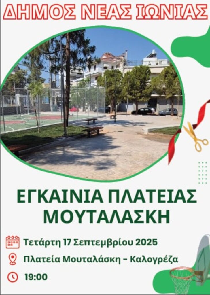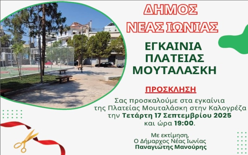 ΝΕΑ ΙΩΝΙΑ Δήμος Νέας Ιωνίας: Εγκαίνια Πλατείας Μουταλάσκη! 17 Σεπτεμβρίου 2025 Filadelfeia News Share this… Facebook Pinterest Twitter Linkedin Δήμος Νέας Ιωνίας: Εγκαίνια Πλατείας Μουταλάσκη! Η ενημέρωση Εγκαινιάζουμε την Πλατεία Μουταλάσκη στην Καλογρέζα, την Τετάρτη 17 Σεπτεμβρίου και ώρα 7.00μ.μ Share: Facebook Twitter Pinterest Linkedin Google+ Email