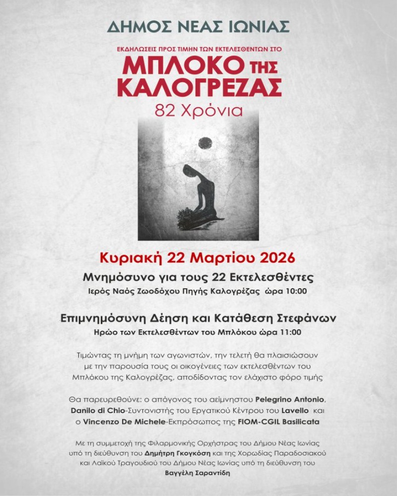 Δήμος Νέας Ιωνίας: Εκδηλώσεις προς τιμήν των εκτελεσθέντων στο μπλόκο της Καλογρέζας