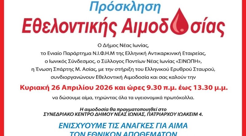 Η Εθελοντική Αιμοδοσία θα πραγματοποιηθεί την Κυριακή 26 Απριλίου και ώρες 9.30 έως 13.30 στο Συνεδριακό Κέντρο του Δήμου Πατριάρχου Ιωακείμ 4 Νέα Ιωνία πλησίον Σταθμού ΗΣΑΠ Νέας Ιωνίας