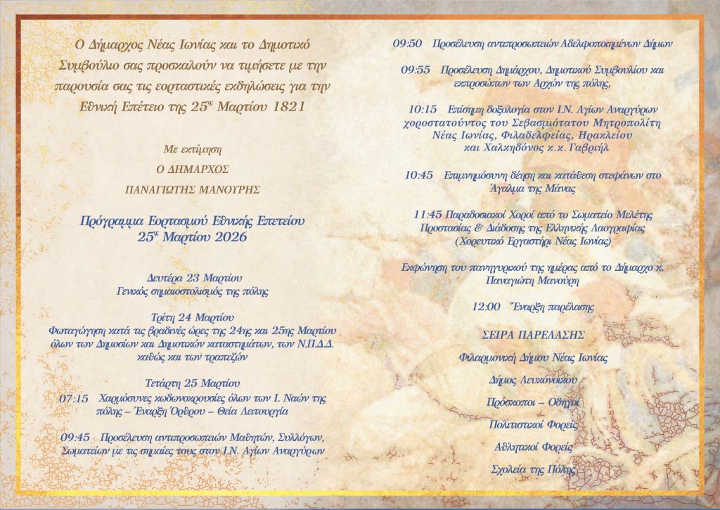 Με κάθε επισημότητα θα πραγματοποιηθούν στη Νέα Ιωνία οι εκδηλώσεις για την Εθνική Επέτειος της 25ης Μαρτίου 1821, από τη Δευτέρα 23 έως και την Τετάρτη 25 Μαρτίου 2026.