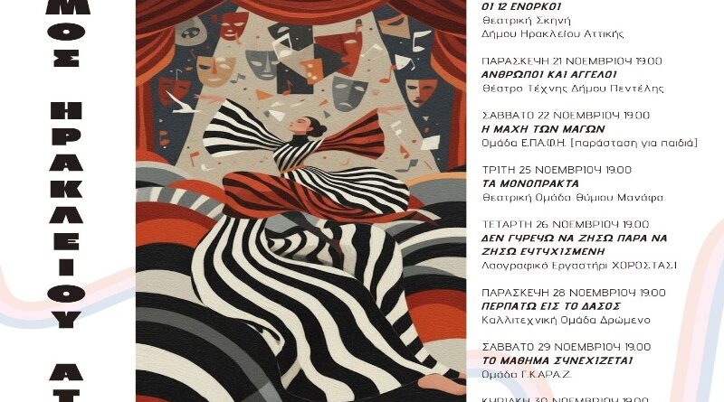 Το 4ο Φεστιβάλ Ερασιτεχνικού Θεάτρου του Δήμου Ηρακλείου Αττικής έρχεται φέτος από τις 16 έως τις 30 Νοεμβρίου για να δώσει βήμα έκφρασης και να παρουσιάσει στο κοινό παραστάσεις από ερασιτεχνικούς θιάσους της Αττικής, στην θεατρική αίθουσα του δημοτικού Πολιτιστικού Πολύκεντρου «Ηλέκτρα Αποστόλου» (Κουντουριώτου και Νεότητος, Ηράκλειο Αττικής, υπόγειο) με ελεύθερη είσοδο για όλες και όλους.