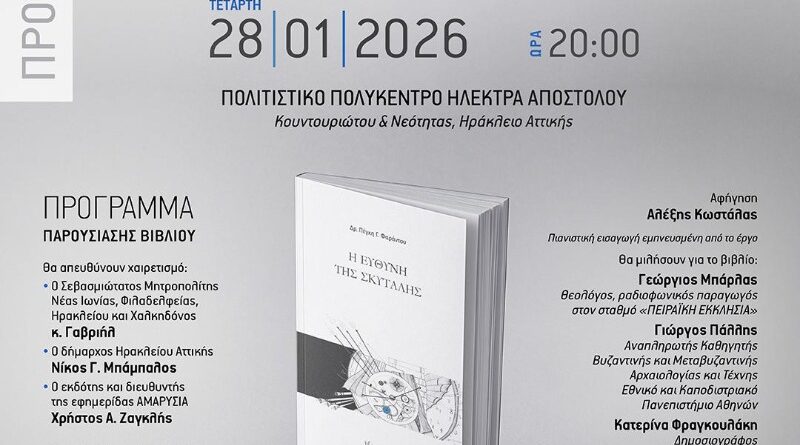 Την παρουσίαση του βιβλίου της δρ. Πέγκης Φαράντου «Η Ευθύνη της Σκυτάλης» φιλοξενεί ο Δήμος Ηρακλείου Αττικής την Τετάρτη 28 Ιανουαρίου στις 20.00 το βράδυ στην κεντρική αίθουσα του Πολιτιστικού Πολύκεντρου «Ηλέκτρα Αποστόλου» (Κουντουριώτου και Νεότητος, Ηράκλειο Αττικής)