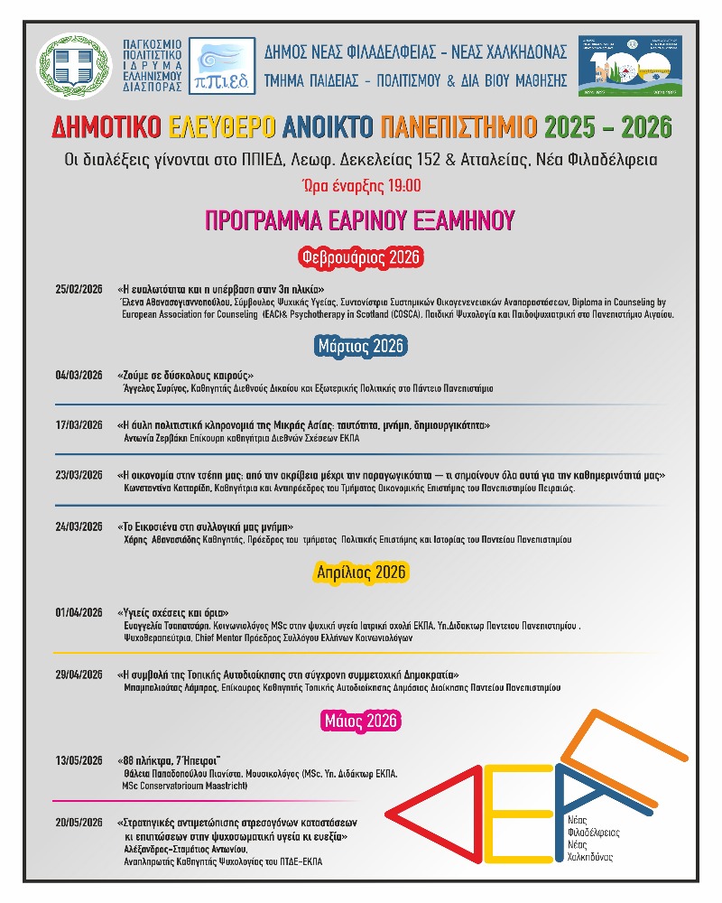 Οι υγιείς διαπροσωπικές σχέσεις και ειδικότερα σε σχέση με τη διατήρηση των ορίων είναι το θέμα της διάλεξης που θα πραγματοποιηθεί στο πλαίσιο του Δημοτικού Ελεύθερου Ανοιχτού Πανεπιστημίου (ΔΕΑΠ) του Δήμου Νέας Φιλαδέλφειας, την Τετάρτη 1 Απριλίου 2026 και ώρα έναρξης 19:00, στο Παγκόσμιο Πολιτιστικό Ίδρυμα Ελληνισμού Διασποράς (ΠΠΙΕΔ), λεωφ. Δεκελείας 152 & Ατταλείας, Νέα Φιλαδέλφειας.
