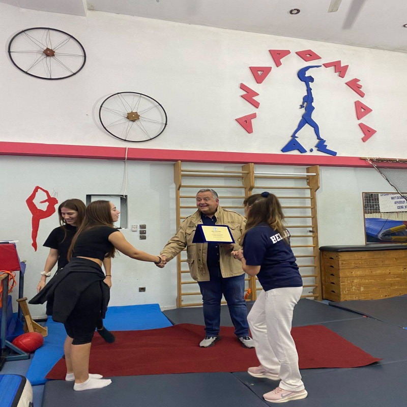 Κατά τη διάρκεια της επίσκεψης, η Διοίκηση του Α.Σ. Ανδρομέδα προχώρησε σε συμβολική βράβευση του Δημάρχου Γιάννη Τομπούλογλου, ως ένδειξη αναγνώρισης για το διαρκές ενδιαφέρον και τη στήριξή του προς τα αθλητικά σωματεία και τη νεολαία της πόλης.