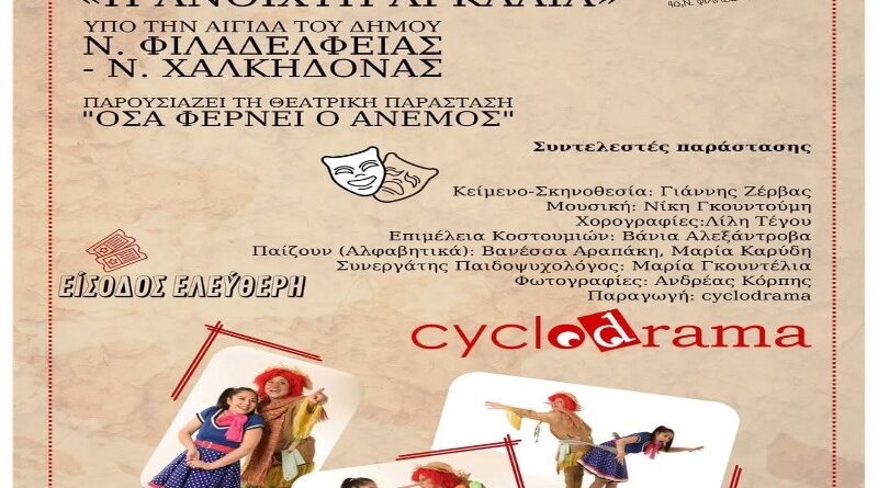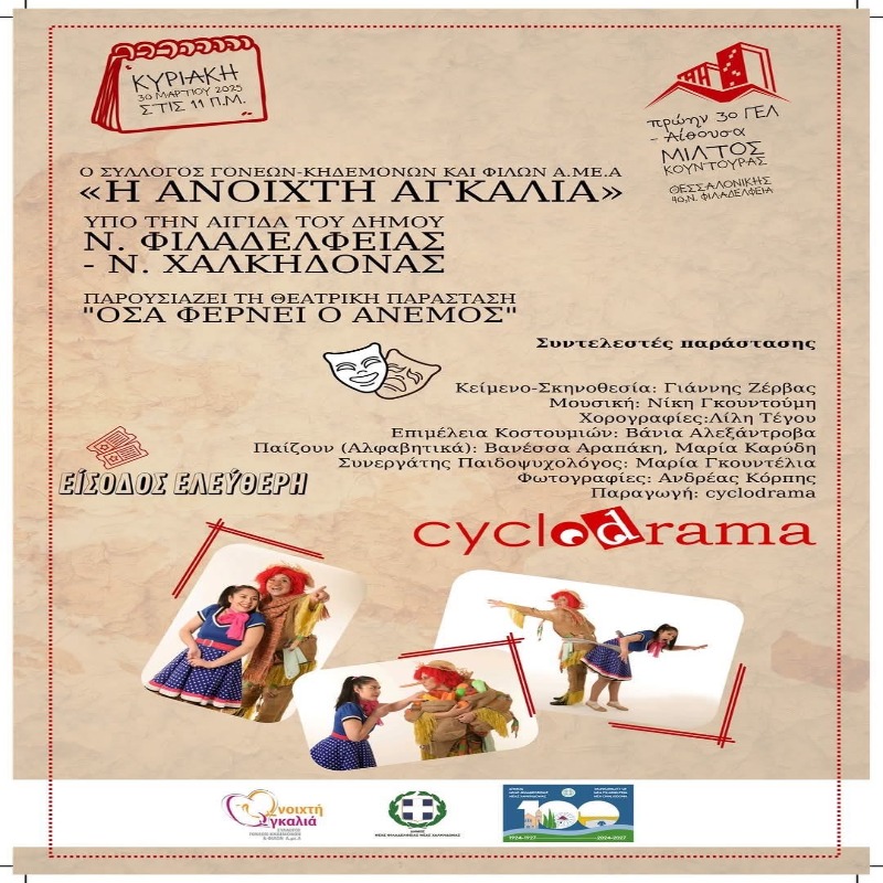 Την Κυριακή 30 Μαρτίου 2025 στις 11 πμ στο πρώην 3ο ΓΕΛ – Αίθουσα Μίλτος Κουντουράς (Θεσσαλονίκης 40 Νέα Φιλαδέλφεια), ο Σύλλογος Γονέων – Κηδεμόνων και Φίλων Α.ΜΕ.Α η “ΑΝΟΙΧΤΗ ΑΓΚΑΛΙΑ”, υπό την αιγίδα του Δήμου Νέας Φιλαδέλφειας-Νέας Χαλκηδόνας, παρουσιάζει τη θεατρική παράσταση “Όσα φέρνει ο άνεμος”, για παιδιά προσχολικής και σχολικής ηλικίας με θέμα την κατανόηση, την αποδοχή και τον σεβασμό της διαφορετικότητας των ατόμων με αναπηρία στο σχολικό και όχι μόνο περιβάλλον.