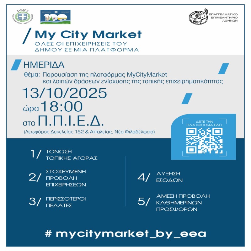 Ο Δήμος Νέας Φιλαδέλφειας – Νέας Χαλκηδόνας, σε συνεργασία με το Επαγγελματικό Επιμελητήριο Αθηνών (Ε.Ε.Α.), διοργανώνουν ημερίδα παρουσίασης της ψηφιακής πλατφόρμας MyCityMarket, η οποία σχεδιάστηκε και αναπτύχθηκε από το Ε.Ε.Α. ειδικά για τους Δήμους, με σκοπό την ενίσχυση της τοπικής επιχειρηματικότητας και τη στήριξη των μικρών και μεσαίων επιχειρήσεων.