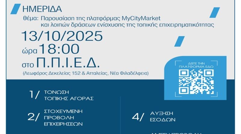 Ο Δήμος Νέας Φιλαδέλφειας – Νέας Χαλκηδόνας, σε συνεργασία με το Επαγγελματικό Επιμελητήριο Αθηνών (Ε.Ε.Α.), διοργανώνουν ημερίδα παρουσίασης της ψηφιακής πλατφόρμας MyCityMarket, η οποία σχεδιάστηκε και αναπτύχθηκε από το Ε.Ε.Α. ειδικά για τους Δήμους, με σκοπό την ενίσχυση της τοπικής επιχειρηματικότητας και τη στήριξη των μικρών και μεσαίων επιχειρήσεων.