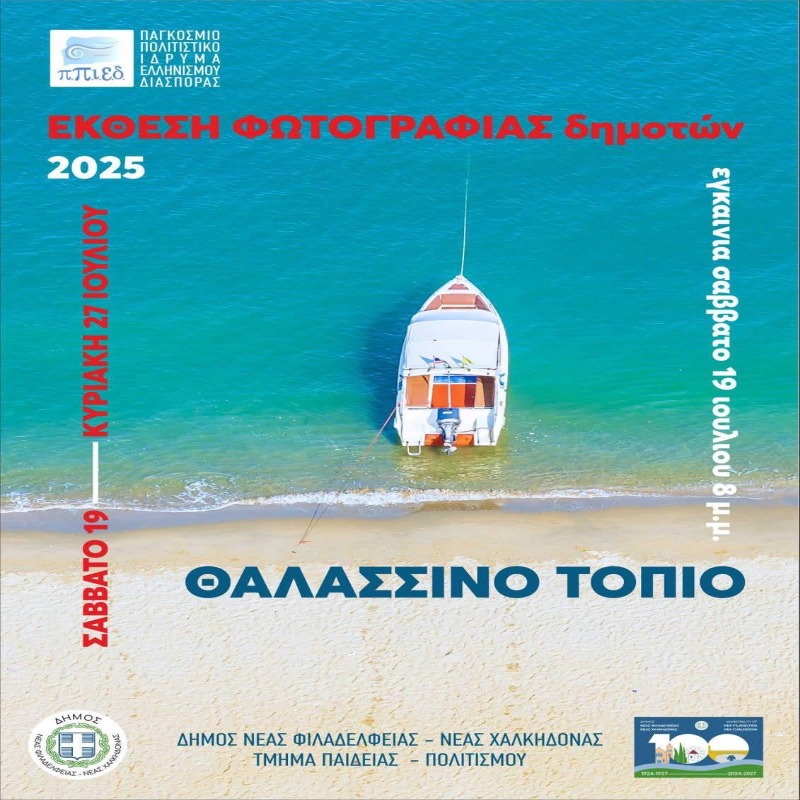 Ο Δήμος Νέας Φιλαδέλφειας – Νέας Χαλκηδόνας και το ΠΠΙΕΔ – Μουσείο Μικρασιατικού Ελληνισμού “Φιλιώ Χαϊδεμένου” σας προσκαλούν στην τελετή βράβευσης των δημιουργών που διακρίθηκαν στον φετινό διαγωνισμό φωτογραφίας δημοτών με θέμα «Θαλάσσινο Τοπίο», η οποία θα πραγματοποιηθεί το Σάββατο 26 Ιουλίου 2025 και ώρα 20:00, στον εκθεσιακό χώρο του ΠΠΙΕΔ (Παγκόσμιο Πολιτιστικό Ίδρυμα Ελληνισμού της Διασποράς).
