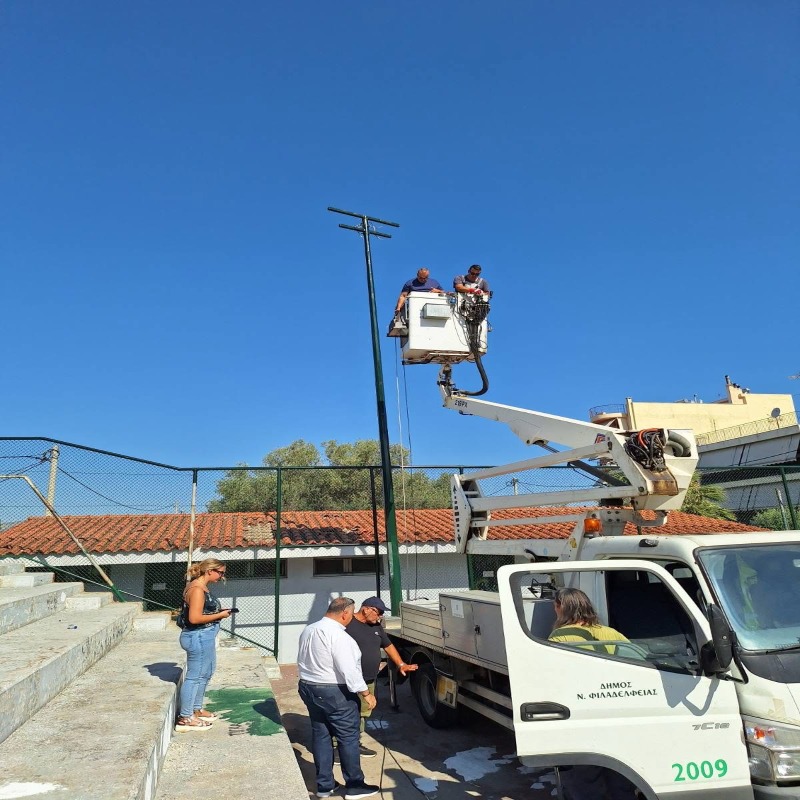 Οι εργασίες υλοποιούνται με αυτεπιστασία, από το Τεχνικό Συνεργείο της Διεύθυνσης Τεχνικών Υπηρεσιών του Δήμου μας, με τη συνδρομή των ηλεκτρολόγων του Τμήματος Ηλεκτροφωτισμού, καθώς και του προσωπικού της Διεύθυνσης Πρασίνου του Δήμου Νέας Φιλαδέλφειας – Νέας Χαλκηδόνας που πραγματοποίησε τις αναγκαίες προπαρασκευαστικές παρεμβάσεις στο πράσινο πέριξ του γηπέδου.