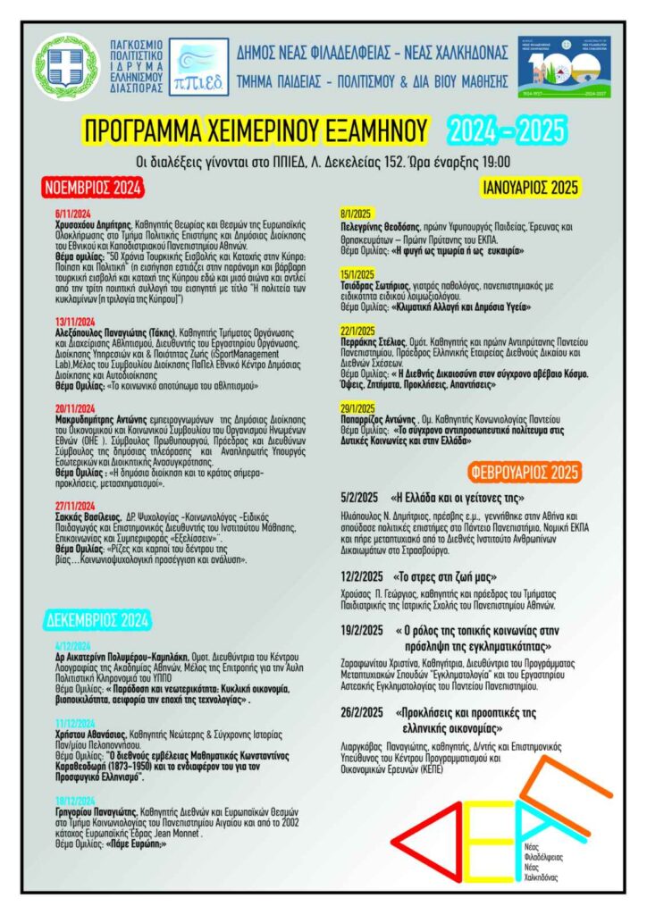 “Με ένα ευρύ φάσμα γνωστικών αντικειμένων και θεματικές ενότητες ξεκινάει τη λειτουργία του κατά το χειμερινό εξάμηνο 2024-25 το Δημοτικό Ελεύθερο Ανοικτό Πανεπιστήμιο (ΔΕΑΠ) του Δήμου Νέας Φιλαδέλφειας- Νέας Χαλκηδόνας. Ένας θεσμός που θα προσφέρει στους συμπολίτες μας τη δυνατότητα να αποκτούν καινούργιες γνώσεις και να αξιοποιούν με τον πλέον ποιοτικό τρόπο τον ελεύθερο χρόνο τους. Η Διά Βίου Μάθηση στο Δήμο μας γίνεται πράξη μέσα από το ΔΕΑΠ και ευχαριστούμε θερμά τους διακεκριμένους πανεπιστημιακούς που συμμετέχουν αφιλοκερδώς, τη συντονιστική επιτροπή του ΔΕΑΠ αλλά και όλους εσάς που θα συμμετάσχετε στην ξεχωριστή αυτή πρωτοβουλία του Δήμου μας.