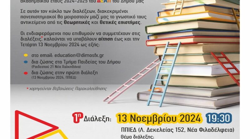 Είμαστε στην ευχάριστη θέση να ανακοινώσουμε την έναρξη της λειτουργίας του Δημοτικού Ελεύθερου Ανοικτού Πανεπιστημίου (ΔΕΑΠ) Νέας Φιλαδέλφειας-Νέας Χαλκηδόνας. Διακεκριμένοι πανεπιστημιακοί θα μοιραστούν μαζί μας το γνωστικό τους αντικείμενο από τις θεωρητικές και θετικές επιστήμες και θα μας φέρουν σε επαφή με τα πολύτιμα αγαθά της γνώσης, της επιστήμης και του πνεύματος.