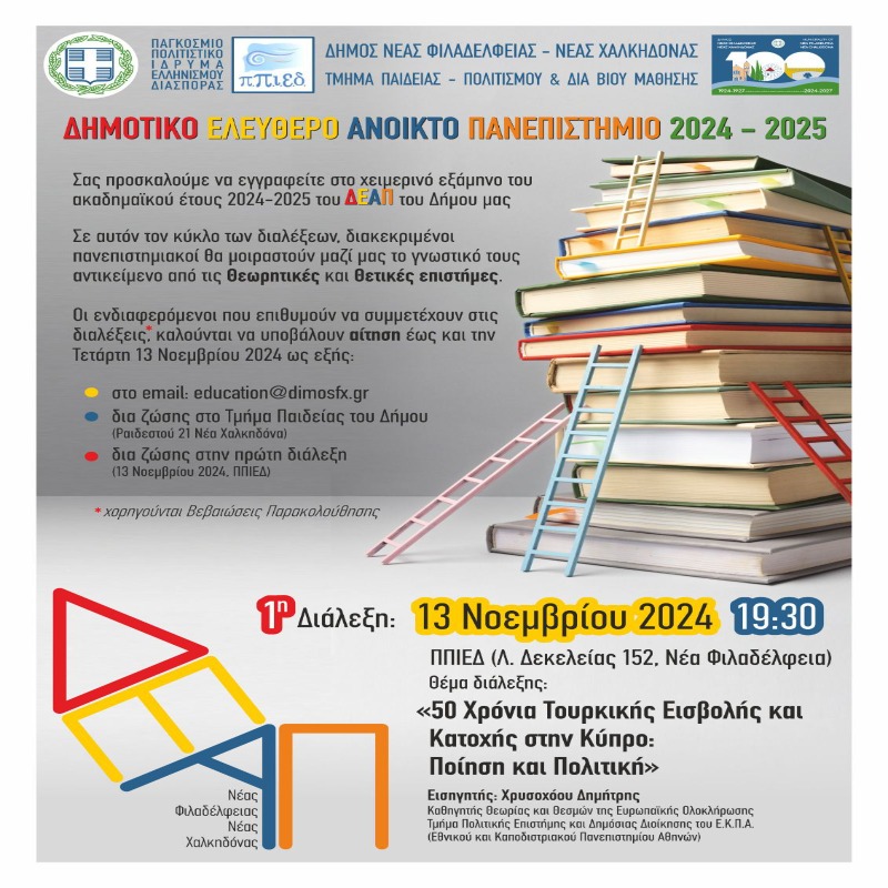 “Με ένα ευρύ φάσμα γνωστικών αντικειμένων και θεματικές ενότητες ξεκινάει τη λειτουργία του κατά το χειμερινό εξάμηνο 2024-25 το Δημοτικό Ελεύθερο Ανοικτό Πανεπιστήμιο (ΔΕΑΠ) του Δήμου Νέας Φιλαδέλφειας- Νέας Χαλκηδόνας. Ένας θεσμός που θα προσφέρει στους συμπολίτες μας τη δυνατότητα να αποκτούν καινούργιες γνώσεις και να αξιοποιούν με τον πλέον ποιοτικό τρόπο τον ελεύθερο χρόνο τους. Η Διά Βίου Μάθηση στο Δήμο μας γίνεται πράξη μέσα από το ΔΕΑΠ και ευχαριστούμε θερμά τους διακεκριμένους πανεπιστημιακούς που συμμετέχουν αφιλοκερδώς, τη συντονιστική επιτροπή του ΔΕΑΠ αλλά και όλους εσάς που θα συμμετάσχετε στην ξεχωριστή αυτή πρωτοβουλία του Δήμου μας.