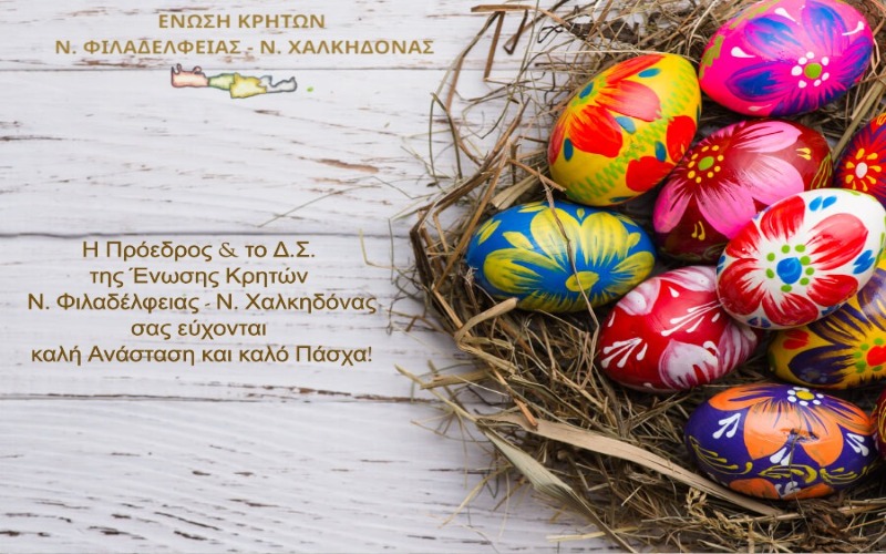 Με αίσθημα παράδοσης και βαθιάς πίστης, η Ένωση Κρητών Νέας Φιλαδέλφειας – Νέας Χαλκηδόνας απευθύνει τις πιο θερμές ευχές της για το Πάσχα προς όλους τους πολίτες.
