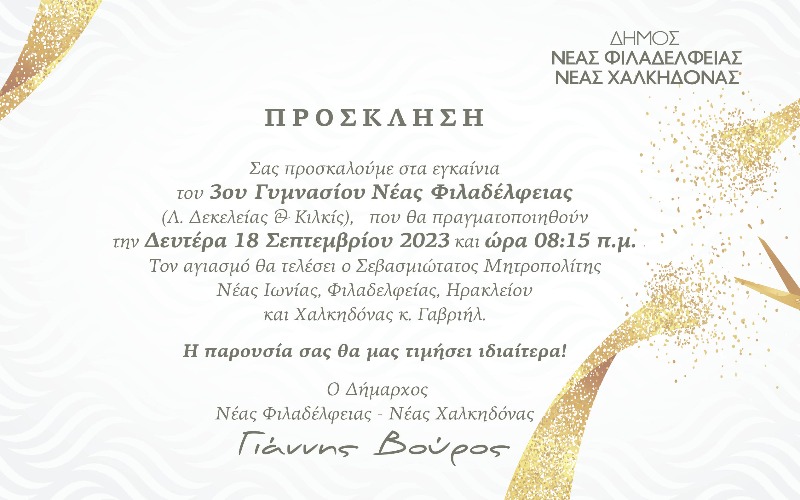 Σας προσκαλούμε στα εγκαίνια του 3ου Γυμνασίου Νέας Φιλαδέλφειας (Λ. Δεκελείας & Κιλκίς), που θα πραγματοποιηθούν την Δευτέρα 18 Σεπτεμβρίου 2023 και ώρα 08:15π.μ.
