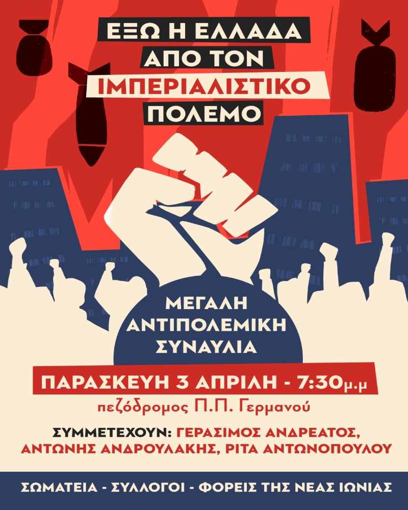 Με πρωτοβουλία της Ένωσης Γονέων Νέας Ιωνίας, σύλλογοι και φορείς της πόλης μας, διοργανώνουμε μεγάλη Αντιπολεμική Συναυλία στη Νέα Ιωνία με τους