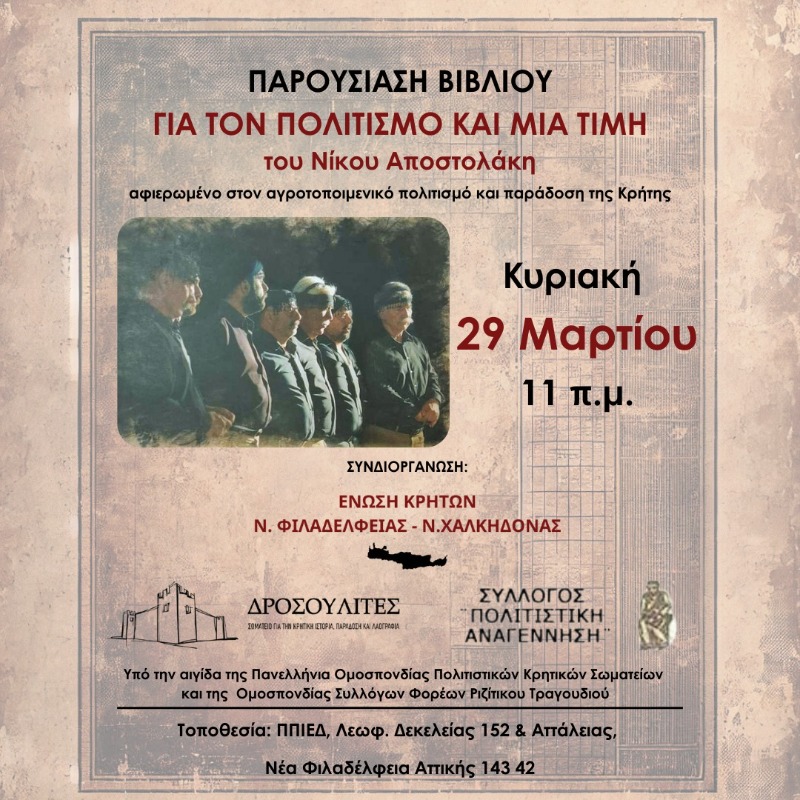 Ένωση Κρητών ΝΦ-ΝΧ: Πρόσκληση σε εκδήλωση: “Για τον Πολιτισμό και Μια Τιμή» του Νίκου Αποστολάκη
