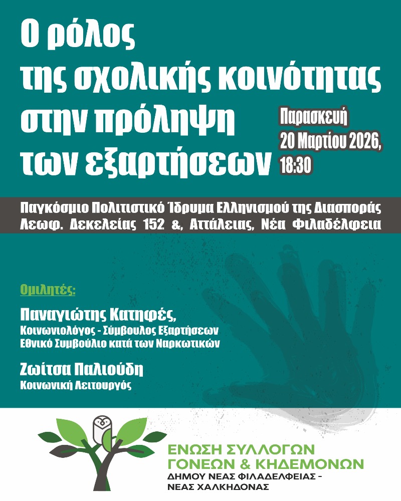 ΤΟΠΙΚΑ ΝΕΑ Ένωση Συλλογων Γονέων & Κηδεμόνων ΝΦ-ΝΧ: Παρασκευή 20 Μαρτίου 6.30μμ στο ΠΠΙΕΔ: Εκδήλωση “Ο ρόλος της σχολικής κοινότητας στην πρόληψη των εξαρτήσεων” 9 Μαρτίου 2026 Filadelfeia News Share this… Facebook Pinterest Twitter Linkedin Ένωση Συλλογων Γονέων & Κηδεμόνων ΝΦ-ΝΧ: Παρασκευή 20 Μαρτίου 6.30μμ στο ΠΠΙΕΔ: Εκδήλωση “Ο ρόλος της σχολικής κοινότητας στην πρόληψη των εξαρτήσεων” Η ενημέρωση Share: Facebook Twitter Pinterest Linkedin Google+ Email