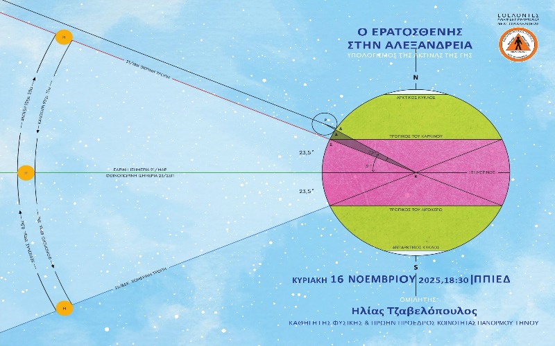 Ενημερώνουμε ότι η προγραμματισμένη, για την προσεχή Κυριακή 16/11, ομιλία του Καθηγητή Φυσικής κ. Ηλία Τζαβελόπουλου με θέμα «Ο ΕΡΑΤΟΣΘΕΝΗΣ ΣΤΗΝ ΑΛΕΞΑΝΔΡΕΙΑ – ΥΠΟΛΟΓΙΣΜΟΣ ΤΗΣ ΑΚΤΙΝΑΣ ΤΗΣ ΓΗΣ» αναβάλλεται. Θα οριστεί εκ νέου η ημερομηνία πραγματοποίησής της.