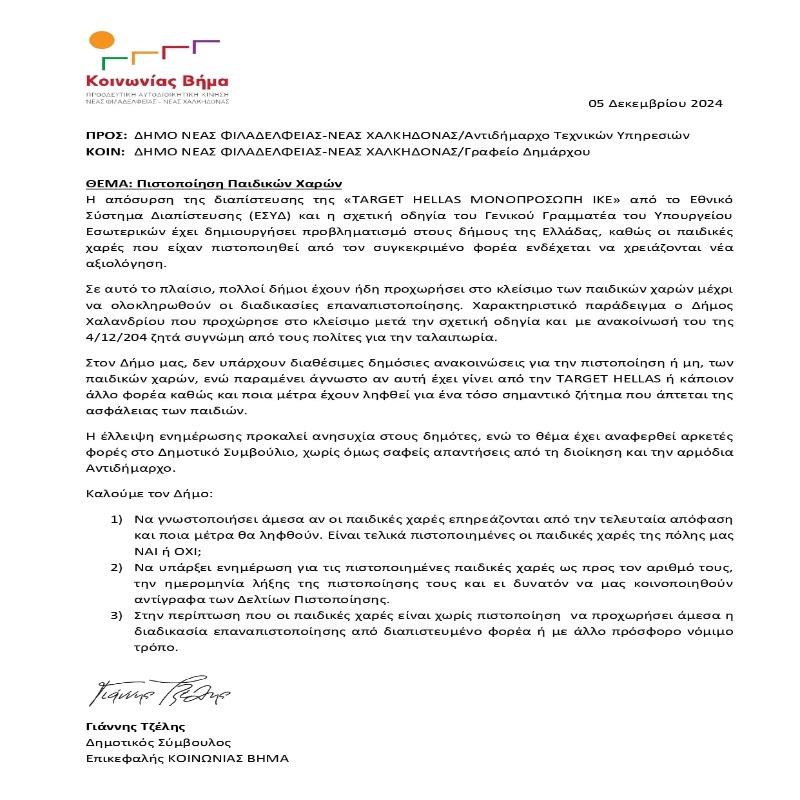 Στον Δήμο μας, δεν υπάρχουν διαθέσιμες δημόσιες ανακοινώσεις για την πιστοποίηση ή μη, των παιδικών χαρών, ενώ παραμένει άγνωστο αν αυτή έχει γίνει από την TARGET HELLAS ή κάποιον άλλο φορέα καθώς και ποια μέτρα έχουν ληφθεί για ένα τόσο σημαντικό ζήτημα που άπτεται της ασφάλειας των παιδιών.