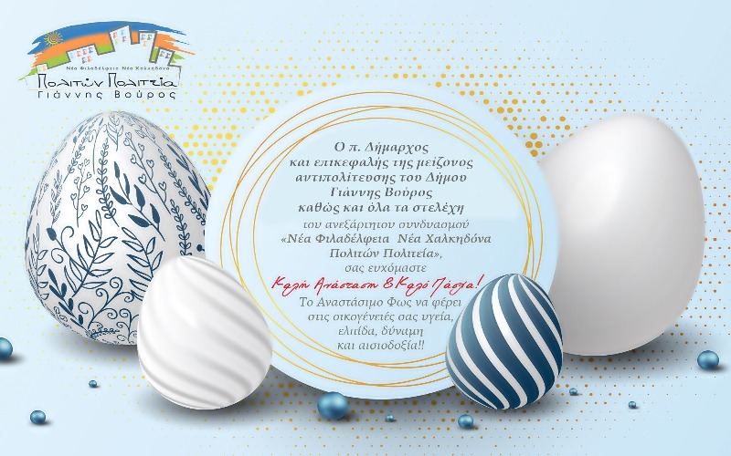Ο π. Δήμαρχος και επικεφαλής της μείζονος αντιπολίτευσης του Δήμου Γιάννης Βούρος, καθώς και όλα τα στελέχη του ανεξάρτητου συνδυασμού “Νέα Φιλαδέλφεια Νέα Χαλκηδόνα Πολιτών Πολιτεία” σας ευχόμαστε ΚΑΛΗ ΑΝΑΣΤΑΣΗ & ΚΑΛΟ ΠΑΣΧΑ!