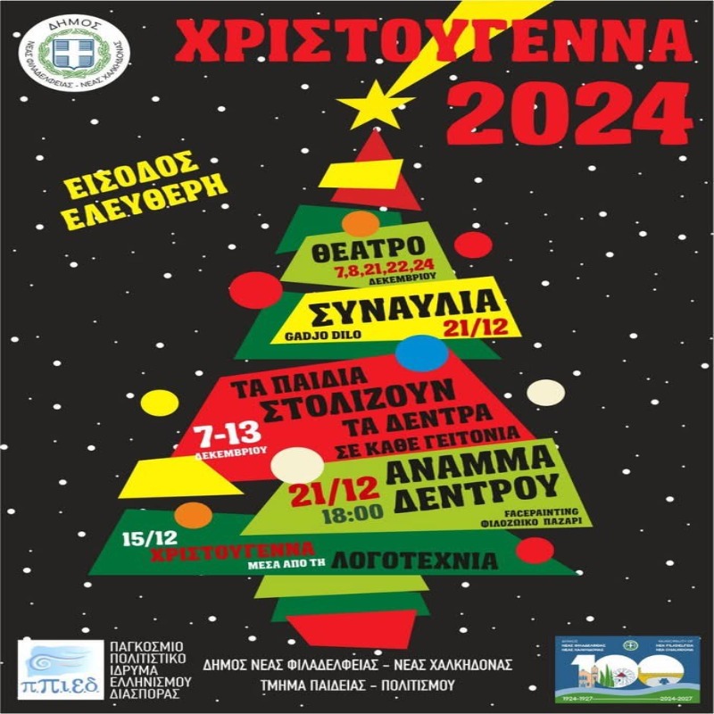 Στο πλαίσιο των εορταστικών εκδηλώσεων ο Δήμος Νέας Φιλαδέλφειας – Νέας Χαλκηδόνας έχει οργανώσει λογοτεχνικά και μουσικά αφιερώματα αλλά και θεατρικές παραστάσεις για μεγάλους και μικρούς, σε συνεργασία με τη θεατρική ομάδα της πόλης μας «Ονειρωδοί» και τα Ονειρωδάκια.