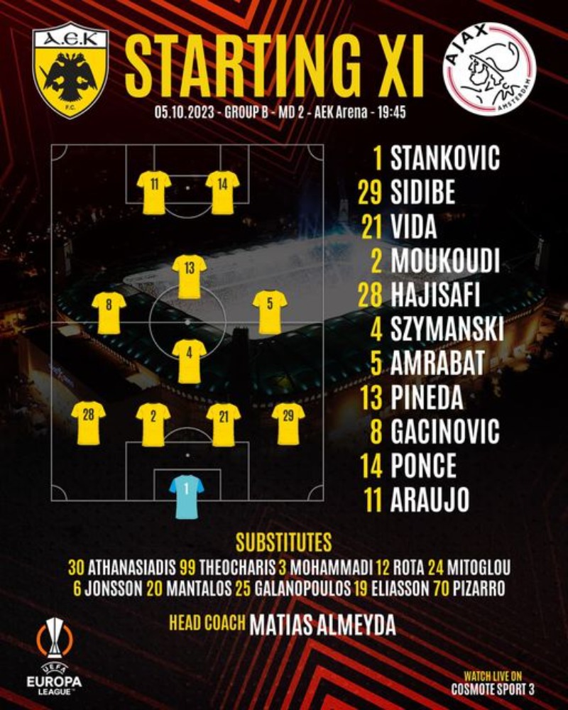 Η ενδεκάδα της ΑΕΚ κόντρα στον Αγιαξ. Με 4-1-3-2 παρατάσει την ομάδα ο Ματίας Αλμέιδα