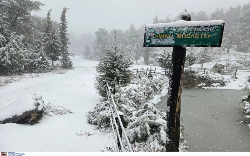 Πυκνή χιονόπτωση σημειώνεται και στο Λεοντάρι Βοιωτίας, ενώ πάγωσε η λίμνη Μπελέτσι στην Ιπποκράτειο Πολιτεία, καθώς δεν έχει σταματήσει να χιονίζει στην περιοχή.