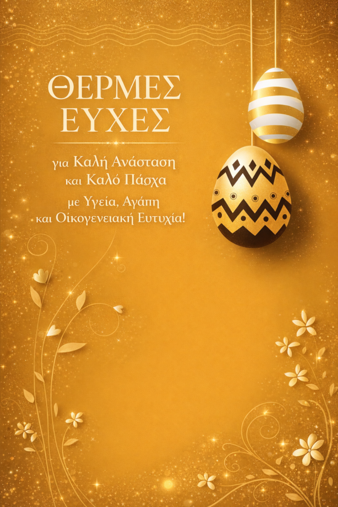 Σε μια περίοδο που η ανάγκη για ανθρώπινη επαφή, αλληλεγγύη και ουσιαστικές στιγμές είναι πιο σημαντική από ποτέ, ευχόμαστε το φετινό Πάσχα να αποτελέσει μια ευκαιρία για επανασύνδεση με όσα έχουν πραγματική αξία: την υγεία, την οικογένεια και την αγάπη.