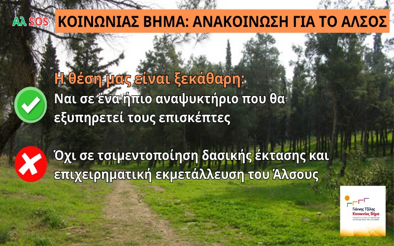 Κοινωνίας Βήμα: Όχι σε τσιμεντοποίηση δασικής έκτασης και επιχειρηματική εκμετάλλευση του Άλσους