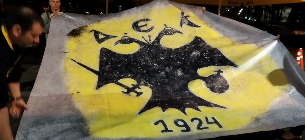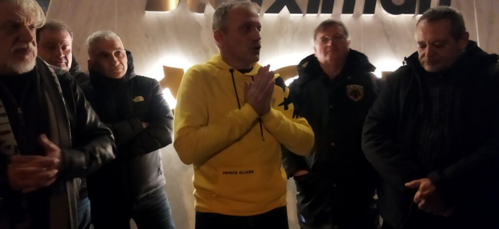 Κοπή Βασιλόπιτας φίλων της ΑΕΚ με παρουσία του δημάρχου ΝΦ-ΝΧ μπροστά στον Αετό της ΑΕΚ εξω απο το Γήπεδο Opap Arena.