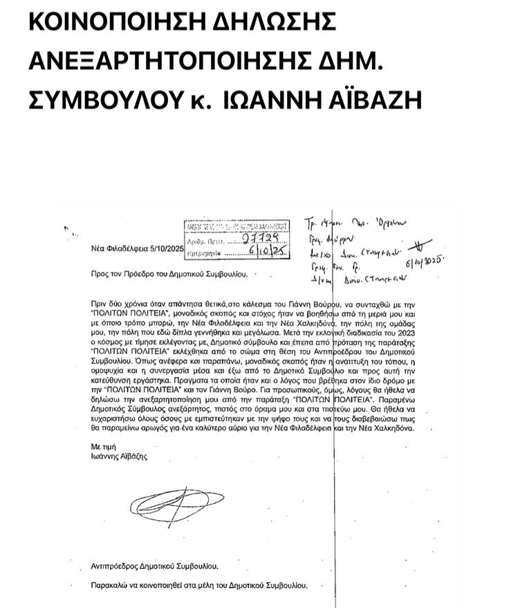 Νέα Φιλαδέλφεια: Ανεξαρτητοποίηση του Γιάννη Αιβάζη – Έστειλε επιστολή στο Δημοτικό Συμβούλιο οπου ενημέρωσε για την απόφαση του.