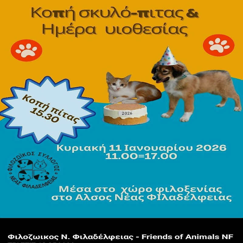 Ο Φιλοζωικός Σύλλογος Νέας Φιλαδέλφειας σας καλεί αύριο, Κυριακή 11 Ιανουαρίου, σε μια ημέρα γεμάτη αγάπη, χαμόγελα και… πίτα! Στο Άλσος Νέας Φιλαδέλφειας, από 11:00 έως 17:00, θα έχετε την ευκαιρία να γνωρίσετε τα αγαπημένα μας ζώα, να συμμετάσχετε στην κοπή πίτας στις 15:30 και, φυσικά, να δώσετε ένα σπίτι σε έναν σκύλο που το χρειάζεται.
